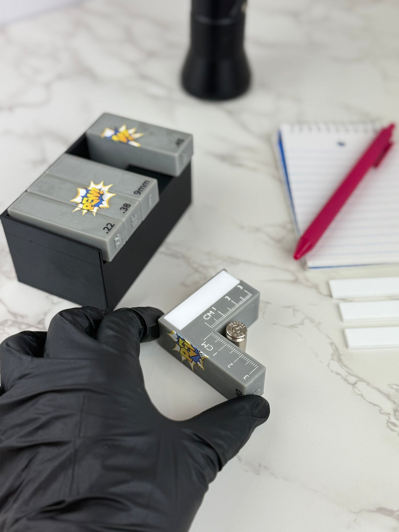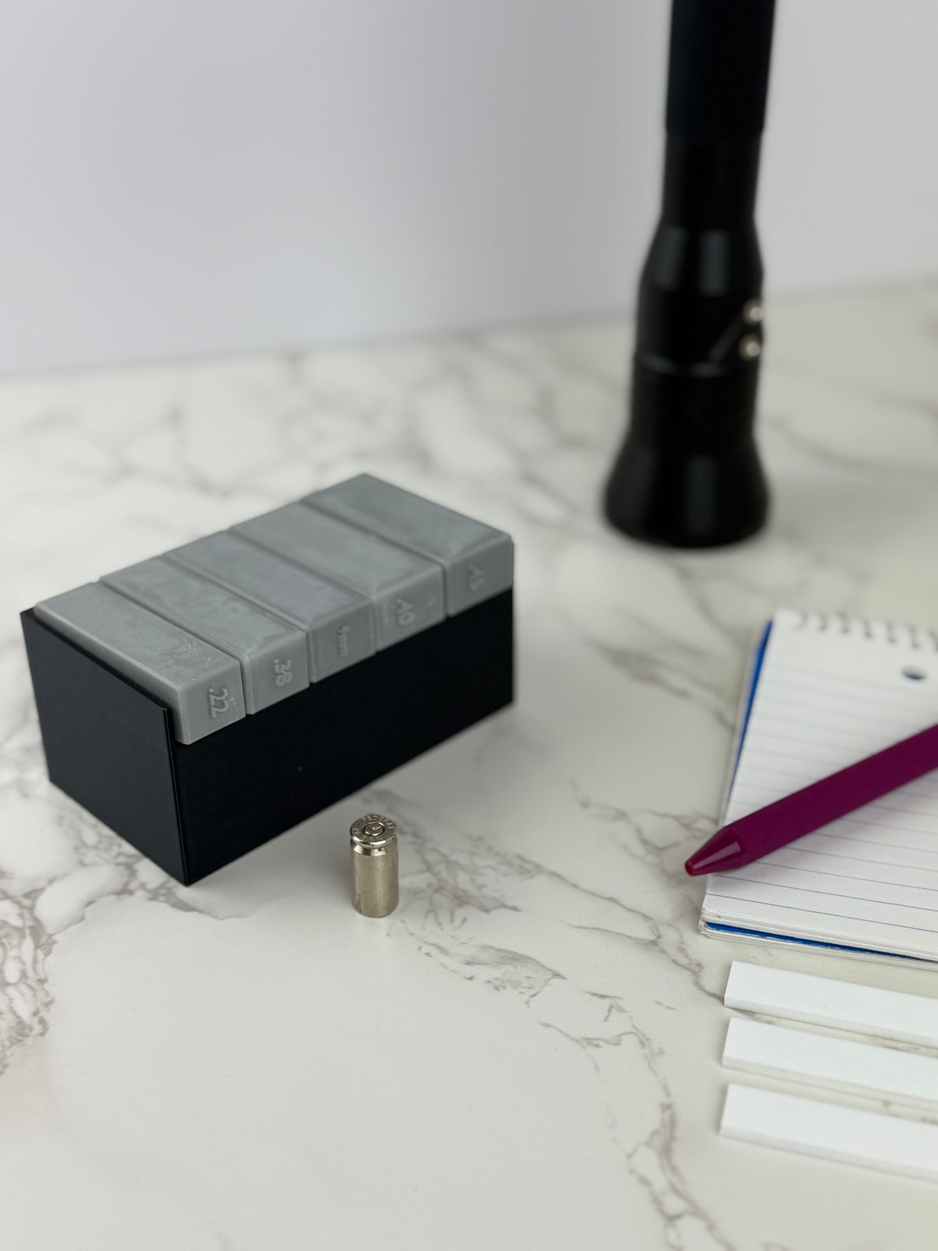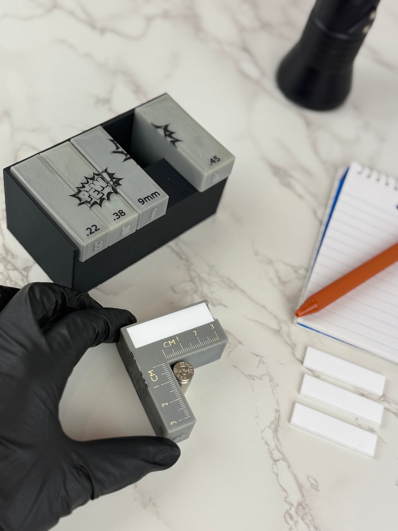 No more awkward setups or constant adjustments—just pick the right scale for your fired cartridge case and snap away! Each scale comes with a built-in metric ruler for precise measurements, raised caliber markings for quick selection, and 15 mini whiteboards so you can easily add case info to your photos. Streamline your evidence processing with this all-in-one tool that makes capturing perfect headstamp shots faster and easier than ever.
